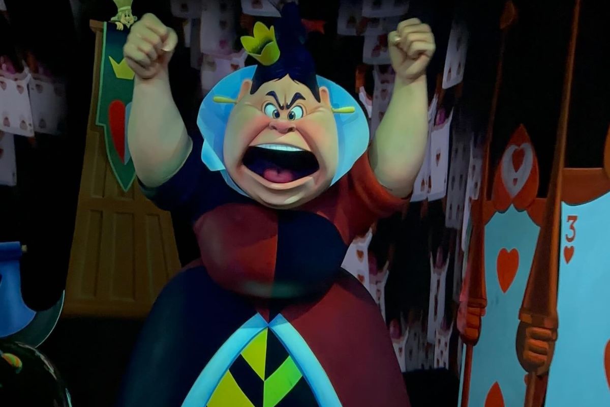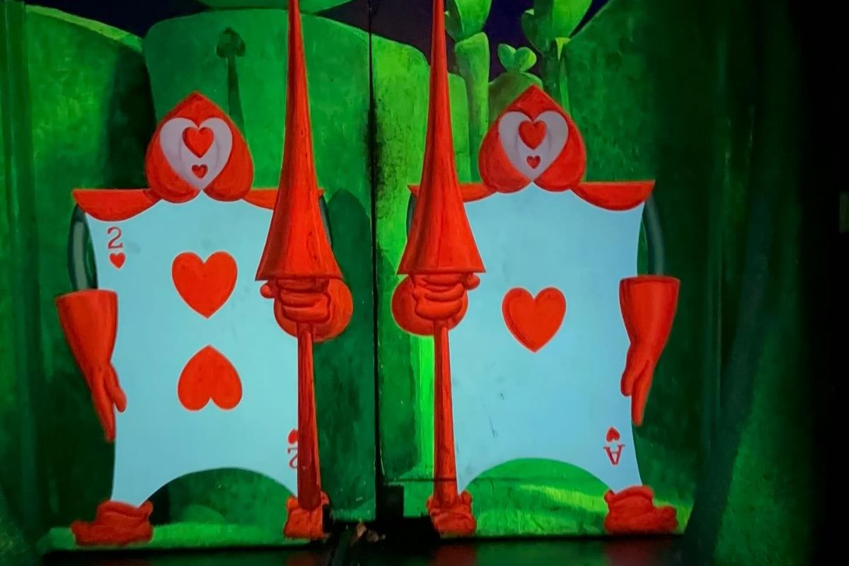This room pictured on Alice in Wonderland with the Queen of Hearts feels a little hotter than the rest of this ride. This is because this scene is directly above the inferno scene on Mr. Toad’s Wild Ride, which is intentionally a hot scene on that ride.