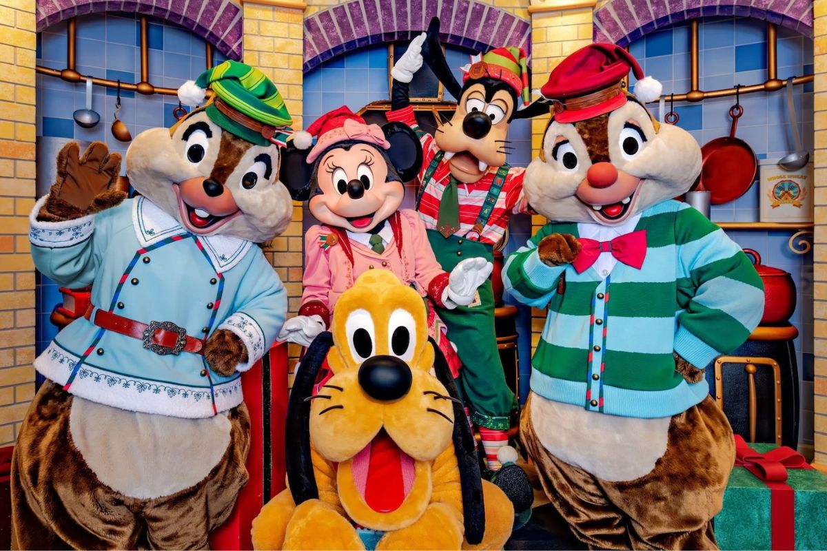 You can always meet classic Disney characters on Buena Vista Street in California Adventure park, but for the holiday season they wear festive attire. Their outfits are very similar to their normal ones, but they have some holly and other touches added to them. Here you can meet Mickey Mouse, Minnie Mouse, Pluto, Goofy, Donald Duck, Daisy Duck, and Clarabelle Cow.