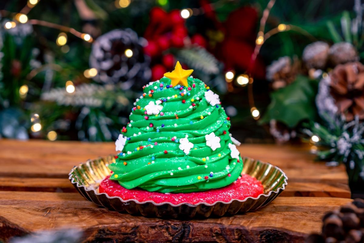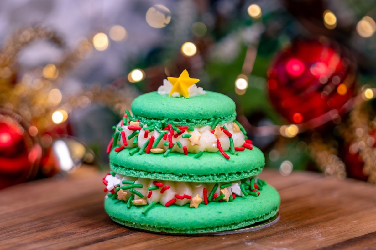 The White Mocha Peppermint Tree-Shaped Macaron is super cute and will likely be very popular this holiday season. It will be at Jolly Holiday Bakery Cafe with mobile ordering available. This is a new menu item this year that will only be available from November 14th through December 14th. It is filled with peppermint buttercream and a coffee bundt cake center. It has red, gold, and green sprinkles on it with a star on top.