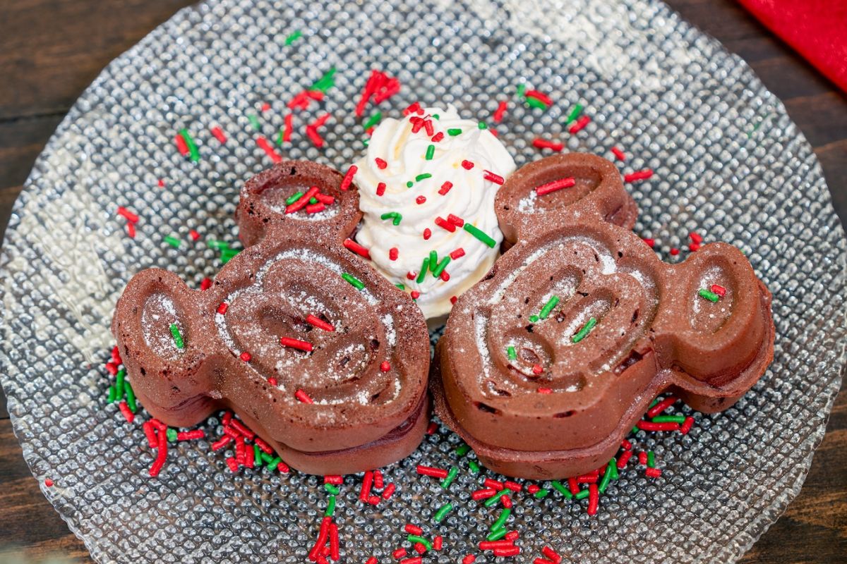 Schmoozies in California Adventure park has a new Christmas menu item this year. They have Red Velvet Mickey Shaped Waffles, which are filled with cream cheese and topped with whipped topping and red and green sprinkles. This restaurant is located in Hollywood Land in California Adventure. Mobile ordering is an option here.